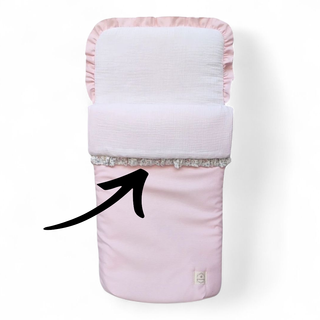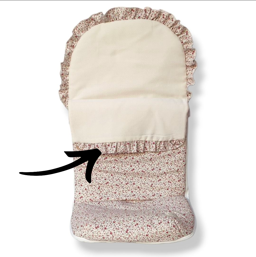 Incluye la opción de volantito debajo de la solapa a tu saco de capazo clásico o saco de silla.
